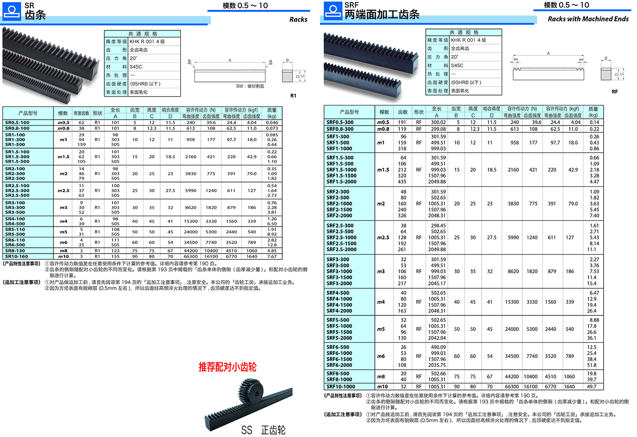 ② KRHG·KRHGF 齒磨齒斜齒齒條及 SRH 斜齒齒條的配對(duì)小齒輪有限制。另外 , 產(chǎn)品的輪齒旋向有右旋及左旋 ,請(qǐng)?jiān)谶x擇時(shí)注意旋向。
