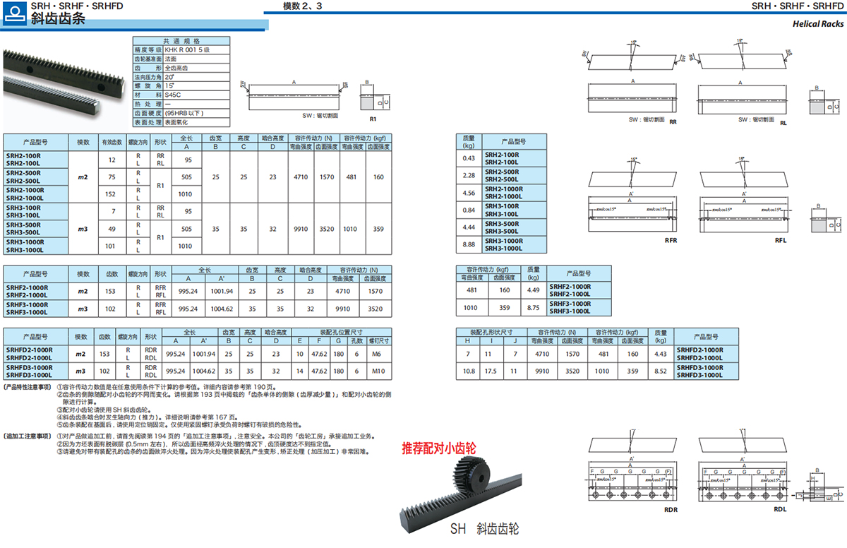 ② KRHG·KRHGF 齒磨齒斜齒齒條及 SRH 斜齒齒條的配對小齒輪有限制。另外 , 產(chǎn)品的輪齒旋向有右旋及左旋 ,請在選擇時注意旋向。