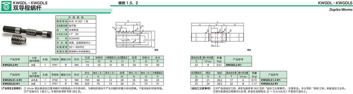 在小型機(jī)構(gòu)中要想實(shí)現(xiàn)高減速比及高轉(zhuǎn)矩,最簡單的方法就是使用蝸輪系統(tǒng)。KHK 的標(biāo)準(zhǔn)蝸桿蝸輪產(chǎn)品,模數(shù)從0.5 ~6,減速比1/10~1/20,備有各種材料及形狀。另外,齒隙量非常小及可以獲得高精度旋轉(zhuǎn)的雙導(dǎo)程蝸桿蝸輪也列入了標(biāo)準(zhǔn)產(chǎn)品的行列中,敬請選用。各種 KHK標(biāo)準(zhǔn)蝸桿蝸輪的特長列于下表。