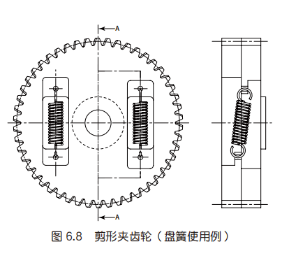 將分為兩半的齒輪利用彈簧等外力與另一個齒輪的輪齒夾緊,以去除輪齒間側(cè)隙。圖6.8示意了其構(gòu)造圖。